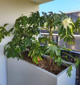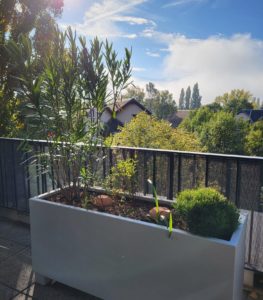 Aménagement d’une terrasse avec des pots et jardinières pour réduire le vis à vis et apporter de la verdure. Utilisation des Ollas de la poterie JAMET (fabrication française) pour limiter les arrosages