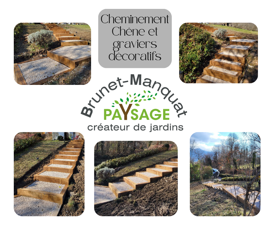 Réalisation d’un cheminement en poutre Chêne et graviers décoratifs qui s’intègre parfaitement au jardin de nos clients.
